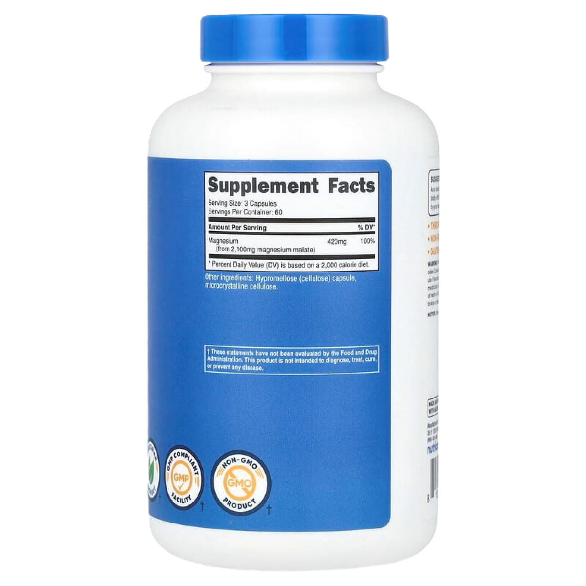 المكونات: مالات المغنيسيوم، غلاف الكبسولة (هيدروكسي بروبيل ميثيل سلولوز)، عامل التعبئة (السليلوز)، عوامل منع التكتل (ثاني أكسيد السيليكون وستيرات المغنيسيوم).