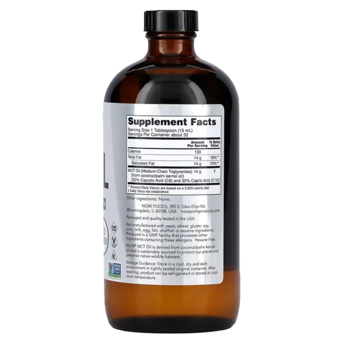 زيت MCT (الدهون الثلاثية متوسطة السلسلة) من NOW Foods هو مكمل غذائي نقي وعالي الجودة مستخلص من زيت جوز الهند. يُمتص بسرعة في الجسم ويُستخدم كمصدر سريع للطاقة، مما يجعله مثاليًا للرياضيين، متّبعي الحميات الكيتونية، أو أي شخص يبحث عن دعم للطاقة والوظائف العقلية تمتص بسهولة في القناه الهضميه واستقلابها بسرعة كبيرة عن طريق الكبد حيث وجد انها تشجع على استخدام الدهون لانتاج الطاقه بدلا من تخزينها تشير العديد من الدراسات الى استبدال زيت MCTبدهون اخرى في نظام غذائي صحي قد يساعد على دعم الوزن الصحي وتكوين الجسم السليم