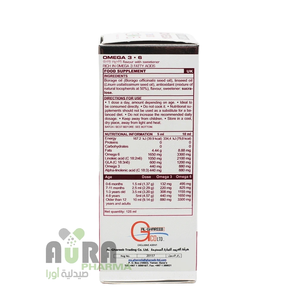 مكمل غذائي يعتمد على زيوت اوميغا نباتية قيمة من لسان الثور (اوميغا 6 ) وبذور الكتان (اوميغا 3 )، والتي تساهم في أداء وظائف القلب والأوعية الدموية والجهاز الهضمي بشكل طبيعي والحفاظ على الجهاز المناعي بشكل طبيعي، خاصة أثناء النمو ونضج الأعضاء عند الأطفال.